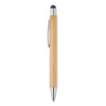 Push button ball pen in bamboo with stylus and shiny chrome fittings. Blue ink. Bamboo is a natural product, there may be slight variations in colour and size per item, which can affect the final decoration outcome.