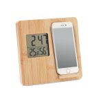 10W Wireless charger device including time, temperature and humidity display, smartphone stand function in bamboo casing. 1 CR2032 included. Wireless output: DC 9V/1.10A (10W) for quick charging. Compatible latest androids, iPhone® 8, X and newer.