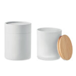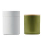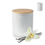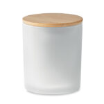 Fragranced plant based wax candle in frosted glass jar holder with bamboo lid. 280 gr. Burn time: 46 hours. Presented in a paper tube gift box.
