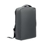 Slim 15 inch laptop backpack in 300D RPET with safe 180 degree opening with 210D RPET lining. Includes laptop compartment, 2 internal slip pockets, 2 internal pen pockets and 2 padded carry handles. Soft padded back and shoulder straps. Suitcase sleeve.