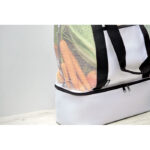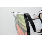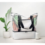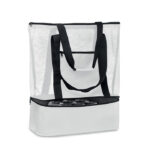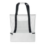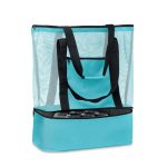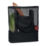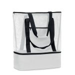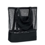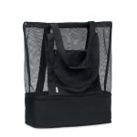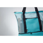 Shopping bag or beach bag with long handles in 600D RPET with RPET mesh and front zipper pocket. Cooler compartment at the bottom.