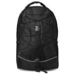 Backpack in 600D polyester with colourful contrasting facing and decorating cord on the front panel. Mesh pockets on both sides.