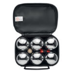 Jeu de boules in metal set supplied in 600D polyester pouch. Weight of 1 ball 730gr and 7,3 cm diameter.