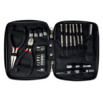 Tool set presented in aluminium case containing 1 nose plier, 1 cutting plier, 1 socket screwdriver, 1 extender, 10 pieces bit set, 1 tweezers and 6 precision screwdriver.