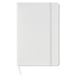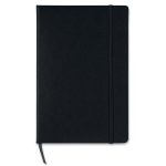 A5 notebook with hard PVC cover. Casebound. 192 squared pages (96 sheets). Matching elastic closure strap and ribbon bookmark.