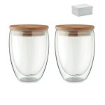 Set of double wall high borosilicate glass with bamboo lid with silicone ring. Capacity 350 ml.