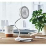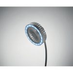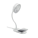 ABS Desktop fan with 3 speed settings with LED light (80 lumens) and 10W wireless charger. Output: DC 9V/1.1A (10W) for quick charging. Compatible with latest Androids, iPhone® 8 and newer.