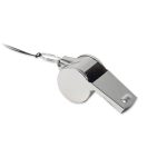 Metal whistle attached to lanyard with safety buckle.